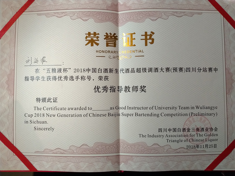11月25日,四川中国白酒金三角酒业协会主办、宜宾五粮液股份有限公司承办的“五粮液杯”2018中国白酒新生代酒品超级调酒大赛预赛在四川宜宾隆重举行,我校食品与生物工程学院刘延波老师带领15级酿酒工程专业学生朱指南和杜重阳以团体赛第二名的成绩入围总决赛。