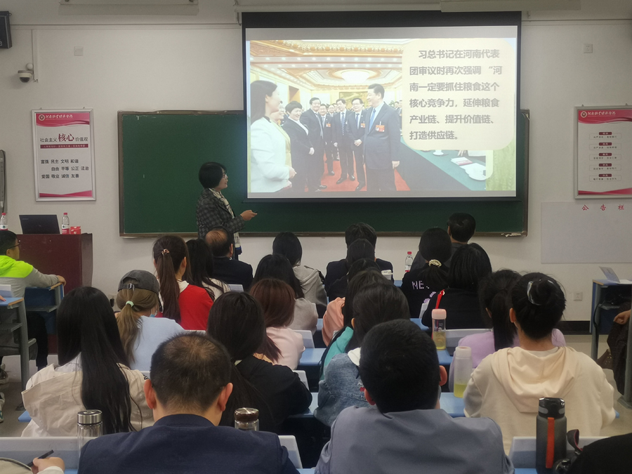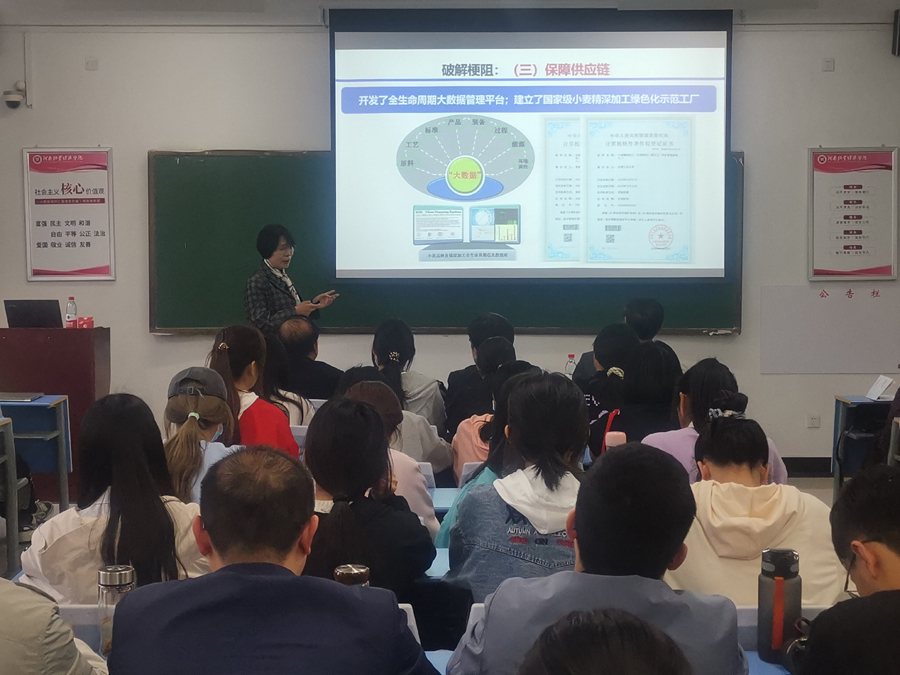 张卫宪校长对黄继红教授在百忙之中到我校讲学表示热烈欢迎,同时对其工作经历、科研背景及卓越成绩进行了简要介绍。黄继红教授长期从事生物发酵与酶催化技术、植物功能因子挖掘及构效关系、营养基因组学与绿色制造等领域研究工作,先后主持国家“十五”、国家“863”、国家绿色制造2025、省杰出青年科学基金等20多项,在小麦高值化利用领域取得了令人瞩目的成绩。黄继红教授首先对学校悠久文化和优美环境表示称赞,对老师和同学们的热情感到激动。黄教授饱含深情地回顾了自己与小麦结缘回到河南走上了小麦深加工科研道路的心路历程,从家国情怀和国家战略的角度大致讲述了国内外小麦加工领域水平和趋势,介绍了河南省的有关产业技术政策。之后,黄继红教授从麦胚蛋白组学解剖进展、研究进展以及相关产业化应用等方面向大家详细介绍了小麦生物转化高值化利用关键技术和麦胚功能蛋白开发利用现状,号召中国科技工作者,一定要树立全产业链理念,延长小麦精深加工产业链,提升小麦价值链,保障供应链,三链融合实现小麦粮头食尾全生命周期高值化利用。最后,黄继红教授展示了她所带领的科研团队在小麦生物转化、麦胚功能蛋白研究开发领域取得卓越成果,展望麦胚功能蛋白产业化的美好前景,强调治未病健康工程是一项具有历史和现实意义的创新性工作,而“药食同源”“妆食同源”理念激起了与会师生的强烈共鸣。报告会在老师、同学们的掌声中落下帷幕。