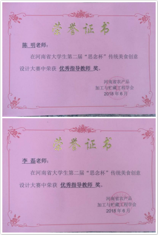 食品与生物工程学院领导高度重视此次大赛,学院团总支精心组织,由学院陈明老师、李磊老师带队,指导2017级烹饪工艺与营养专业三名学生积极备战。其中,学生徐文强的作品“浮棕”以独特的“水晶+粽子的创意”获得了大赛一等奖和最佳创意奖,作品“五色粉”获得三等奖;学生宋丽爽的作品“百味小棕”和张小旭的“椰谷饼干”获得优秀奖;陈明老师和李磊老师获得优秀指导老师奖。