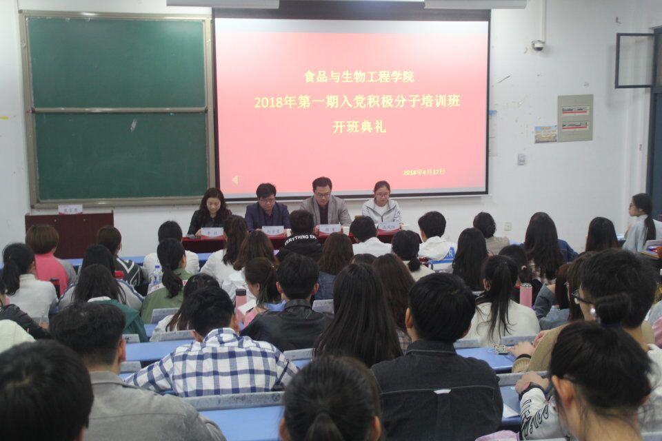 为增强党的基本理论教育,引导广大入党积极分子端正入党动机,了解党的基本知识,根据校组织部的安排,结合食品与生物工程学院工作实际,4月17日晚,食品与生物工程学院在龙子湖校区1号教学楼合402教室举办了2018年第一期入党积极分子培训班开班典礼,院党总支书记赵安勇、党总支副书记杨军,原食品工程学院团总支书记李欣,辅导员高凤阳出席此次开班典礼,共有126名学院参与此次党课培训,会议由李欣老师主持。