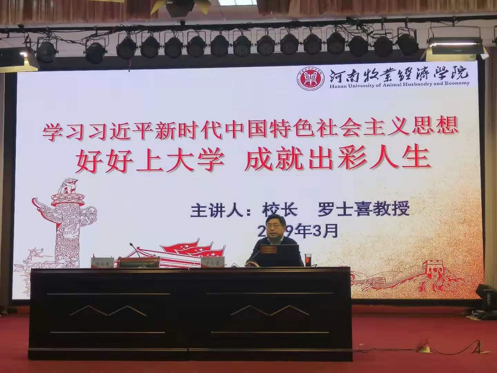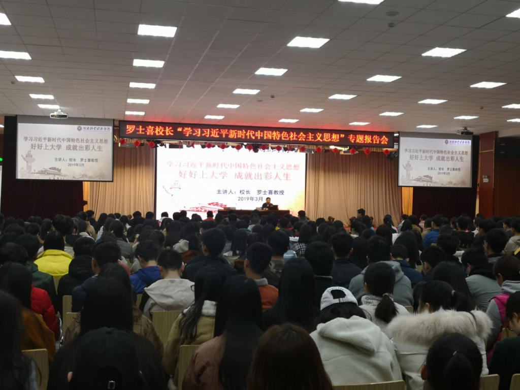 报告中,罗校长结合我们党和国家的发展历程、奋斗史,讲述了中国共产党从无到有的过程、老一辈中国共产党人为实现中华民族伟大复兴所做出的努力和牺牲、改革开放以来中国由一穷二白走向民富国强的过程、及党的十八大以来,在以习近平同志为核心的党中央领导下,中国在各个方面所取得的傲人成就,层层递进,用详实的事例展示了中国共产党的初心和使命,引导广大同学认识到坚持中国共产党领导的正确性;并通过讲解习近平新时代中国特色社会主义思想的重要意义、核心要义、理论品格、精神特质、逻辑框架和丰富内涵,为师生阐释坚持习近平新时代中国特色社会主义思想在新时代发展中的必要性和重大意义;进一步解析党的十九大报告中提出的“八个明确”、“十四条基本方略”,引导同学们正确的理解当代大学生的历史使命,为实现中华民族伟大复兴不懈奋斗。随后,罗校长从当代大学生的成长特点出发,激励同学们树立正确的世界观、人生观、价值观,激发大家的学习动力、明确学习目标、学会追求美好生活和感受美好生活;并向同学们分享了大学生实现德智体美劳全面发展的路径规划,引导同学们坚定理想信念,拥有家国情怀,珍惜机缘,坚持做正确的事,时刻保持有爱的心。