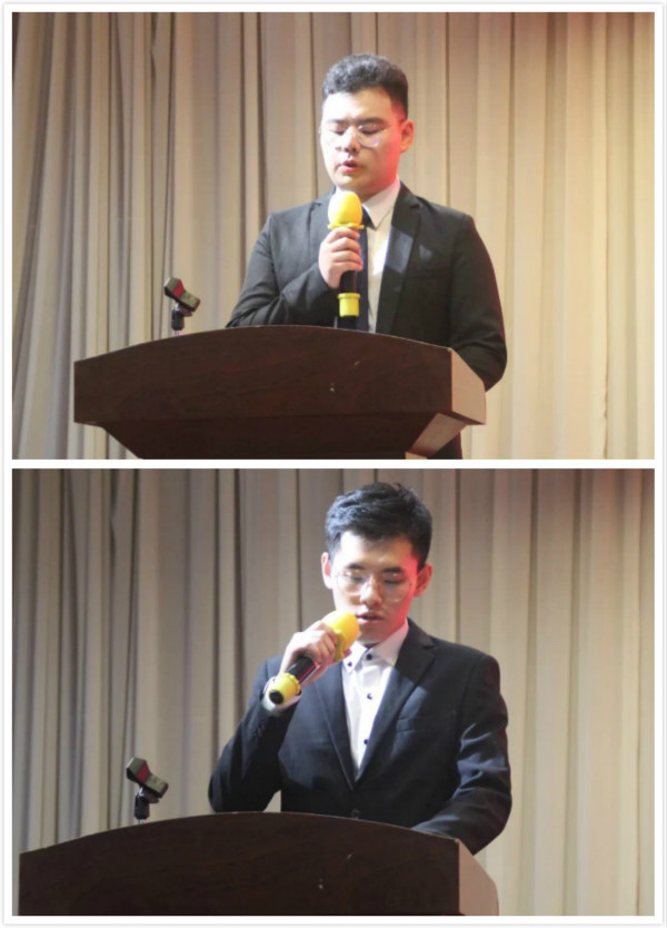 优秀毕业生代表杨玉玺和在校生代表仲威宇发言