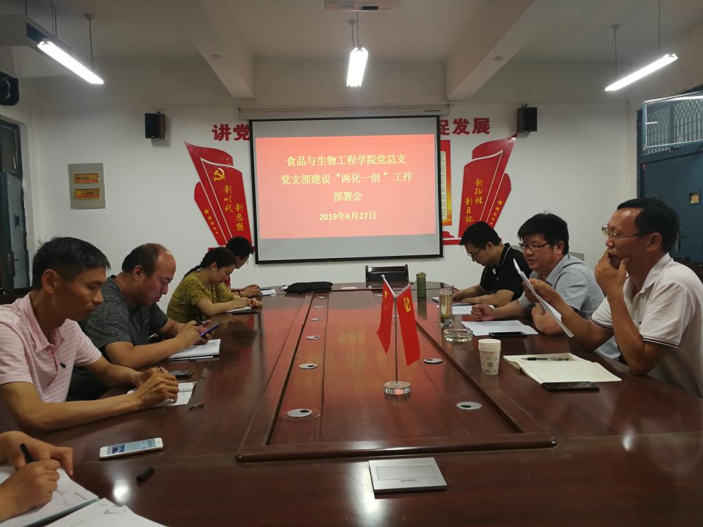会上,杨国政同志首先传达了学校庆祝建党98周年七一表彰暨“两化一创”动员会议精神,重点深入学习了校党委书记穆瑞杰和党委副书记李波的讲话内容,领学了学校《关于印发〈党支部建设“两化一创”工作实施方案〉的通知》(校党【2019】49号)文件具体要求。随后,杨军同志领学了《中国共产党党员教育管理工作条例》,进一步明确了新时期党员教育管理的新要求和新任务。最后,赵安勇同志就食品与生物工程学院党总支各党支部建设“两化一创”工作做总体安排,就“两化一创”工作计划、方法步骤、建设标准、时间要求提出了具体要求。他强调,今年是“两化一创”工作的开局之年,大家要提高政治站位,统一思想认识,各党支部要对标自查,逐项落实,建立问题台账,对不达标的事项要切实加强整改提升;各党支部书记是本支部“两化一创”工作的具体责任人,要严格按照学院党委统一部署安排,扎实开展工作,确保我院“两化一创”工作落地见实效。