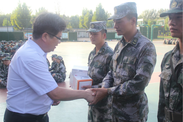 9月21日下午,食品与生物工程学院(酒业学院)党委书记赵安勇、副书记杨军、正科级组织员李欣和19级新生辅导员一行来到军训现场看望慰问教官及新同学。