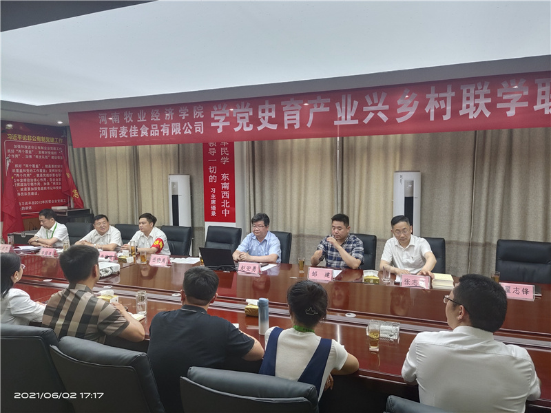 2021年6月2日,食品与生物工程学院党委与河南麦佳食品有限公司党支部“学党史、育产业、兴乡村”联学联建活动在驻马店新蔡县河南麦佳食品有限公司举行,食品与生物工程学院党委书记赵安勇、副院长邹建、岳晓禹,麦佳集团党支部书记、董事长张志良,党支部副书记、集团执行总裁翟志峰,新蔡县孙召镇镇长李艳波及河南麦佳食品有限公司18名正式党员和8名入党积极分子参加了本次活动。