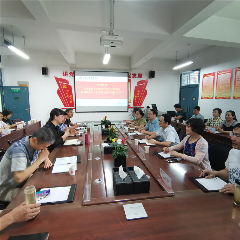 信阳农林学院食品学院院长邢淑婕、园艺学院院长龚守富、生物与制药学院院长段鸿斌,分别于5月10日、6月3日和6月4日带队到我院考察交流。双方在龙子湖校区善知楼A426会议室召开了座谈会,食品与生物工程学院院长潘春梅、副院长岳晓禹、郝修振、邹建,党政办主任郭宏伟,科研办主任郑鸣,教学办主任王静以及相关教研室主任参加了座谈会,会议由院长潘春梅主持。