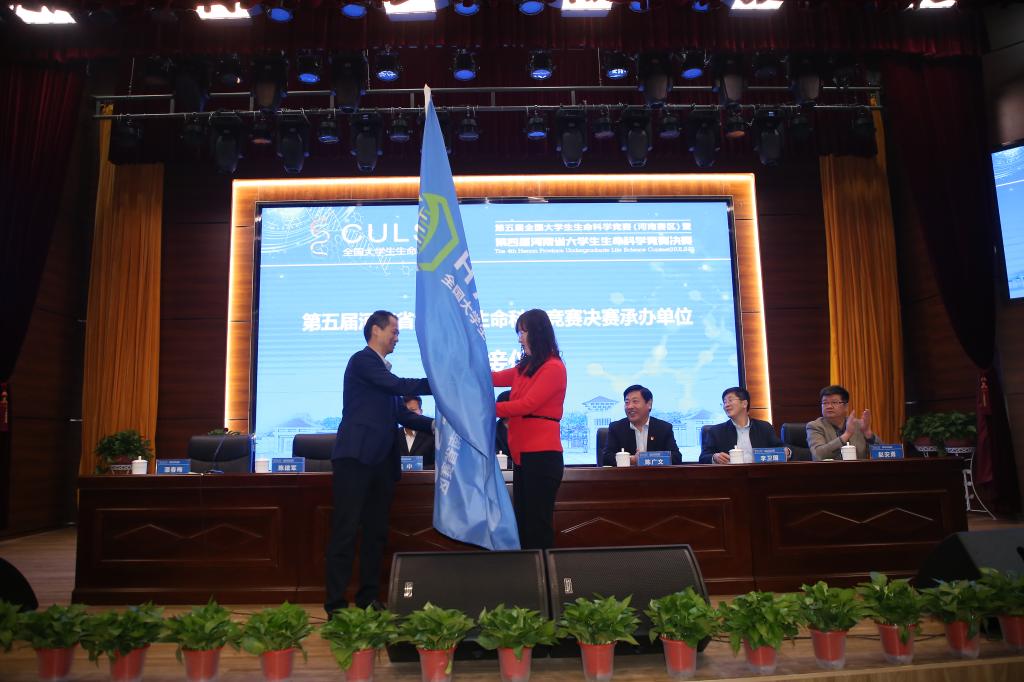 组委会副主任李卫国对本届大赛进行了总结,本届大赛是参赛最多、涉及面最广的一次盛会,本届大学生生命科学竞赛充分贯彻了教育部以赛促教,以赛促学,以赛促发展的方针,和提高能力、加强交流、促进发展的原则,整个赛事主题明确、规范有序、特色鲜明。从初赛阶段网评到决赛阶段的视频录制和现场答辩,各参赛队伍充分展现了砥砺奋进、勇立桥头的拼搏精神,尤其是决赛期间同学们不畏强手、勇于拼比,评委们兢兢业业、客观公正,工作人员精心服务、密切配合,为本届学科竞赛的圆满成功提供了有力的保障。最后宣布黄淮学院作为河南省第五届大学生生命科学竞赛承办单位并授旗。