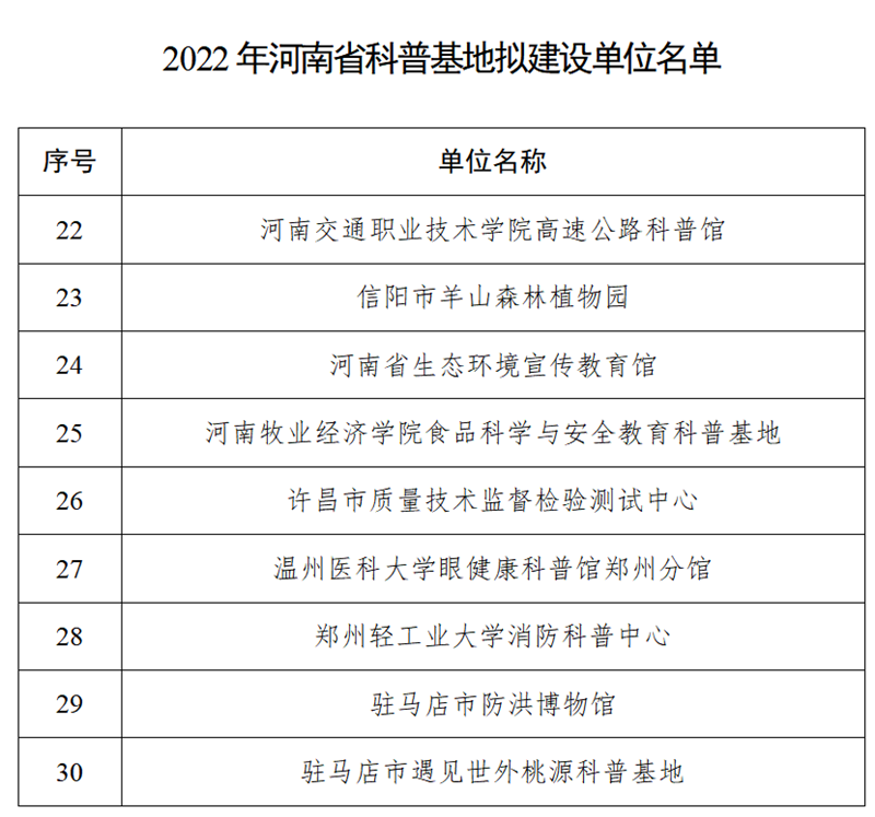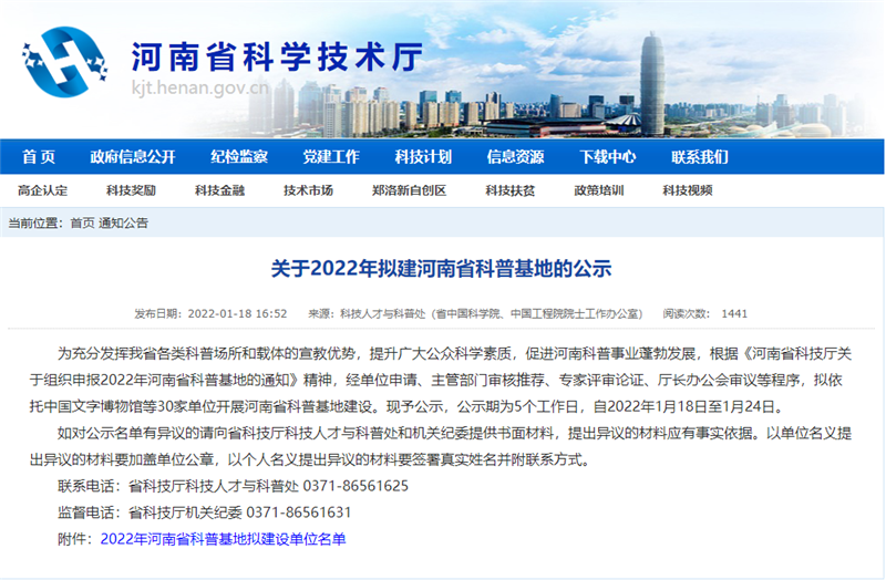 2022年1月18日,河南省科技厅公布了2022年拟建河南省科普基地名单,此次共有30家单位开展河南省科普基地建设,其中高校单位仅有8所,我校“食品科学与安全科普教育基地”成功入选。这是继豫酒文化馆之后我院又一省级科普基地。河南省科普基地项目旨在充分发挥我省各类科普场所和载体的宣教优势,提升广大公众科学素质,促进河南科普事业蓬勃发展。入选单位通过开展科普基地建设,可进一步为我省的科普教育事业做出贡献。