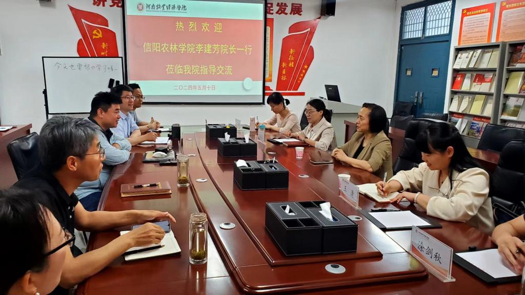 2024年5月10日,信阳农林学院食品科学与工程学院院长李建芳、副院长朱静、教研室主任王清和实验教学中心主任涂剑秋一行4人来食品与生物工程学院考察交流。校长尹新明教授、食品与生物工程学院院党委书记赵安勇、院长邹建热情接待了李院长一行。参加座谈的还有学院副院长郭宏伟、郑鸣,食品科学与工程教研室主任高雪琴、实践教学中心主任李长滨,院长邹建主持座谈会。