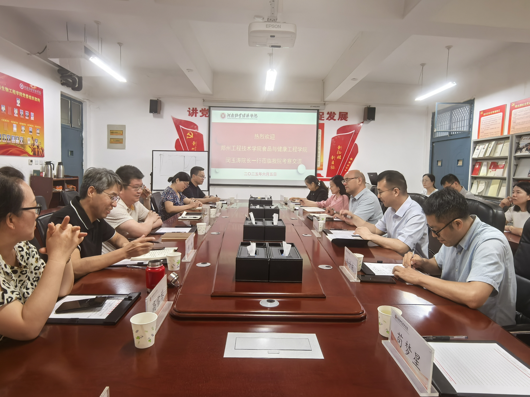 2025年6月5日,郑州工程技术学院食品与健康工程学院院长闵玉涛、副院长张军、河南省速冻食品工程技术研究中心主任聂卉等一行8人,到我院进行交流学习,食品与生物工程学院党委书记赵安勇、副院长郭宏伟、郑鸣等参加交流座谈。