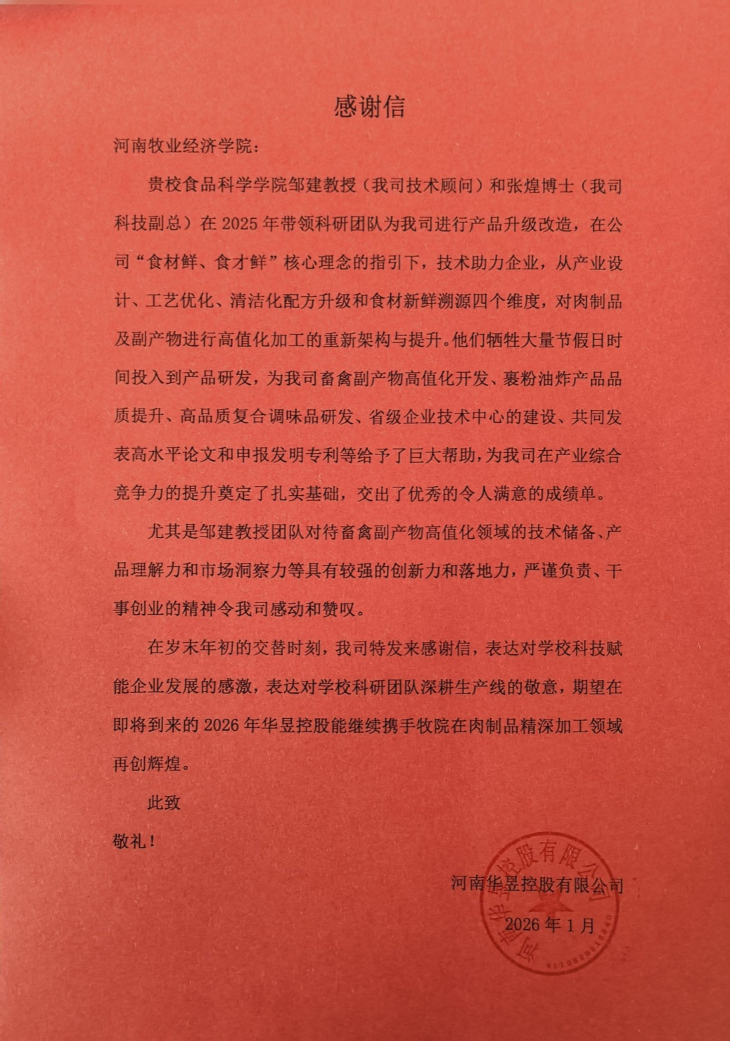 在感谢信中,河南华昱控股有限公司详细回顾了双方的合作历程。公司在“食材鲜、食才鲜”核心理念引领下,致力于产品与技术的全面升级。邹建教授团队精准对接企业需求,以深厚的专业素养和务实的研究精神,从产业设计、工艺优化、清洁化配方升级和食材新鲜溯源四个关键维度入手,对肉制品及其副产物的高值化加工进行了系统性重新架构与全面提升。自双方合作以来,邹建教授团队展现出高度的敬业精神与强烈的责任感。他们牺牲大量节假日休息时间,全心投入研发一线,围绕企业面临的现实挑战展开攻关,取得了一系列实质性成果。