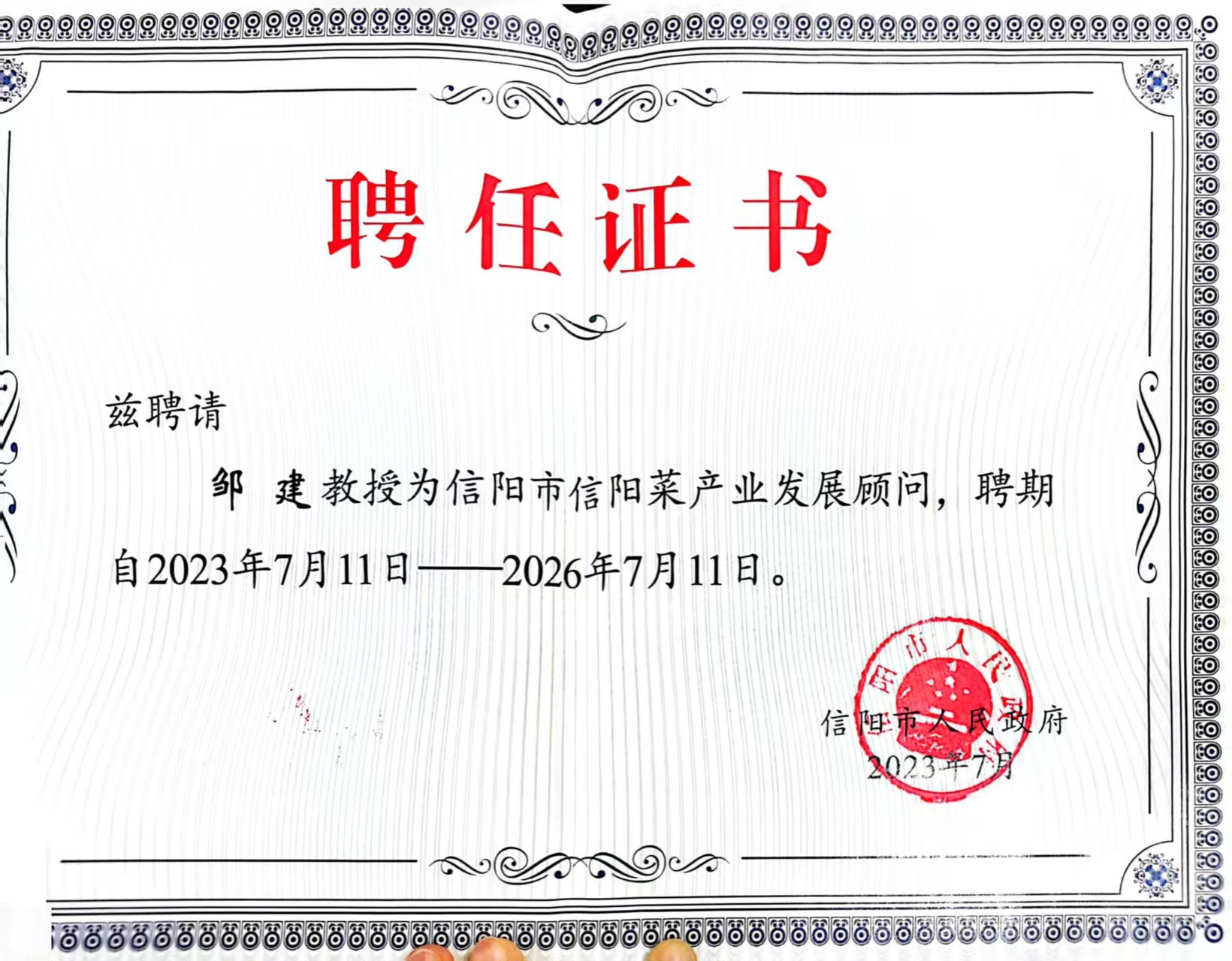 揭牌仪式上,高雪琴教授回顾了我院深刻践行学校百名专家助百村(企)工程,与信阳市农业科学院多年来的紧密合作,共同制定多项产业化团体标准和地方标准,助力信阳菜健康、快速发展的成效。表示我院科研团队将一如既往支持研究院的技术研发与人才培养,共同推动信阳菜产业向标准化、营养化、高端化等方向发展。信阳市农科院党组书记钟思志在致辞中,特别向我院邹建教授带领的预制菜团队长期对信阳菜产业化的指导与帮助,并强调此次揭牌是“产、学、研、用”深度融合的重要体现,将为地方农业产业链延伸与乡村振兴提供科技支撑。揭牌仪式后,向邹建教授颁发了“信阳市信阳菜产业发展顾问”证书,进一步强化了双方在技术攻关与产业规划方面的协同。
