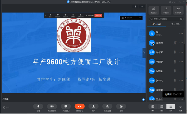 2020年3月14日全天,食品与生物工程学院开展了2020届本科毕业论文(设计)第二次开题答辩。第二次答辩共73人分三组,每组均由博士或高级职称教师担任答辩评委。本次答辩会是在疫情期间,本着以学生为本,在学生未返校前采取网络会议形式开题,为后续论文高质量完成预留了充分时间。答辩前由各答辩秘书提前建立钉钉APP会议室,于3月12日前建立开题答辩网络会议室,并将本组学生及答辩专家提前安排进会议室,预先演练。