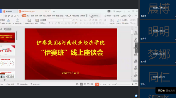 会议由伊赛集团郑州分部人事经理刘晓梦主持,刘经理介绍了参会的领导和同学代表,并展示了2020年伊赛集团在战役请、保民生、促发展等方面取得的骄人成绩。大家都被伊赛集团“百年伊赛 ,兴农强民”的企业使命和“感恩回馈、共克时艰”的家国情怀深深感动。