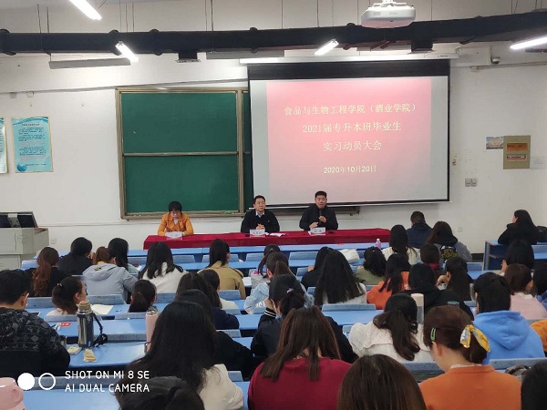 2020年10月20日上午,食品与生物工程学院(酒业学院)2021届食品科学与工程、食品质量与安全、酿酒工程专业专升本学生生产实习动员会在1号教学楼合504召开。院党委副书记赵贺然、副院长邹建、教学办公室主任王静、相关专业负责人和指导教师代表参加了本次动员会,会议由副书记赵贺然主持。