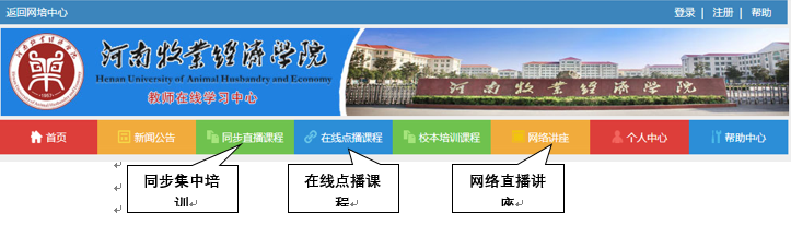 图1 教师在线学习中心同步集中培训、在线点播课程和网络直播讲座所在位置