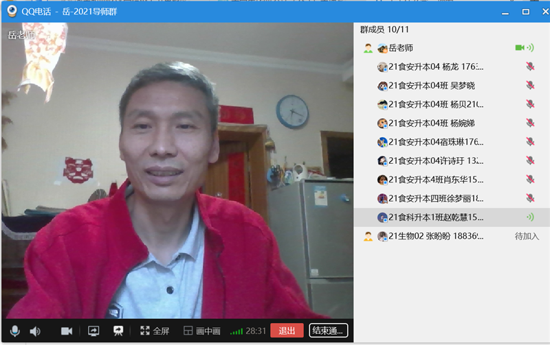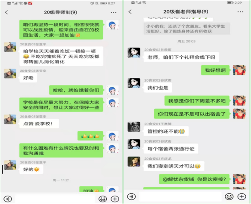 食安教研室的每位老师通过微信聊天,视频连线等方式,对所带的学生进行一一指导和帮扶,了解学生目前的心理状态,解答学生面临的困惑。通过了解得知,目前学生情绪比较稳定,学生纷纷表示此次疫情他们真切地感受到了学校带给他们的关怀和温暖。岳晓禹副院长在跟21专升本的学生视频聊天后得知部分学生出现焦虑情绪,主要原因是在找毕业论文指导老师过程中受挫,岳院长了解这一情况后积极安慰学生,鼓励学生,并向学生保证最后肯定会让每位学生都有指导老师带,消除了学生的顾虑。陈威风老师通过和学生视频聊天发现部分学生在学习上存在懒散的情况,比如有部分同学在上网课的时候喜欢躺到床上,导致学习效率较低等问题。了解到这一情况后,陈威风老师积极地帮助学生出谋划策,杜绝这种坏习惯的继续发展。李长滨老师从疫情对生活学习的影响谈起,告诫大家要适应这种学习生活状态,把握时间,屏蔽焦虑,学习上互相鼓励,生活上互相帮扶,情感上互相交流。王钊和苏楠老师指导同学们要遵守学校的防疫规定,规划好自己的学习和生活。李靓叮嘱学生在上网课过程中一定要认真学习,同时制定自己的短期规划,及早复习,不要浑噩过日子,同时要求学生利用空余时间提前复习考试课重点知识,避免出现课程不及格的现象。胡燕和崔丽伟两位老师通过微信群分别向所带学生传达她们对学生的关怀和温暖,寄望同学们多阅读、多思考,多写读书笔记;充分利用新媒体平台,开展网络学习。常惟丹和辛婷老师指导学生一定要配合学校的疫情防控工作,建议学生们在学习的同时不要忘记锻炼身体。