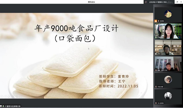 2022年11月5日,我院食品科学与工程专业2023届毕业论文(设计)开题答辩以线上的形式顺利完成。食品科学与工程专业2023届毕业生共计150人,分为7组,其中实验3组,设计4组。学院副院长(主持工作)邹建教授巡视并参与了开题答辩全过程。