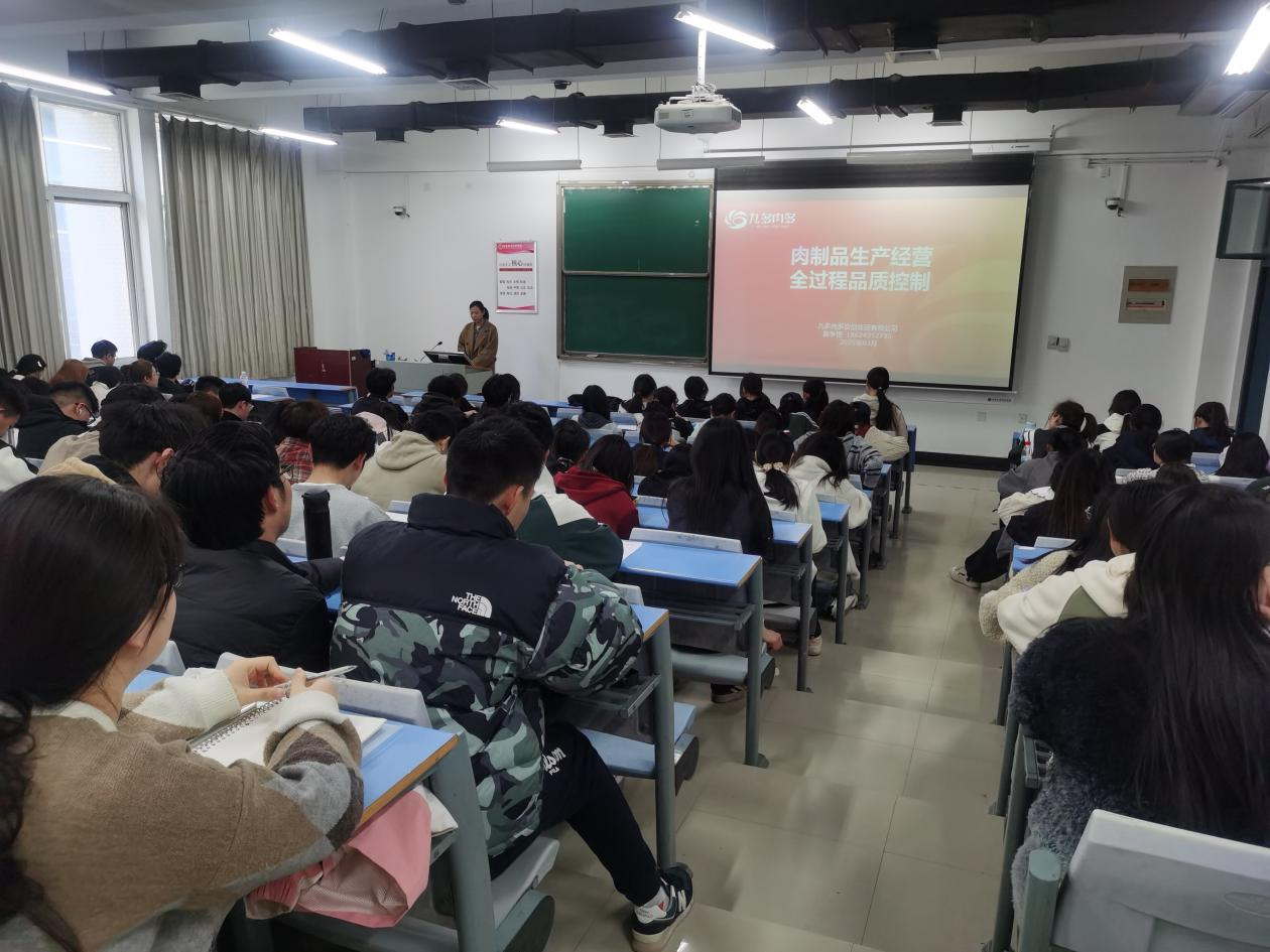 2025年3月20日下午,食品与生物工程学院邀请河南省“技术能手”、新乡市“高技能人才”、河南农业大学食品学院硕士生导师、九多肉多食品集团有限公司实验室主任盖争艳女士在一号教学楼合304作“肉制品生产经营全过程品质控制”的主题讲座。食品与生物学院副院长郑鸣教授、食品科学与工程教研室主任高雪琴博士及180名学生参加。这是本专业继上学期之后的第五次进阶课程讲座。