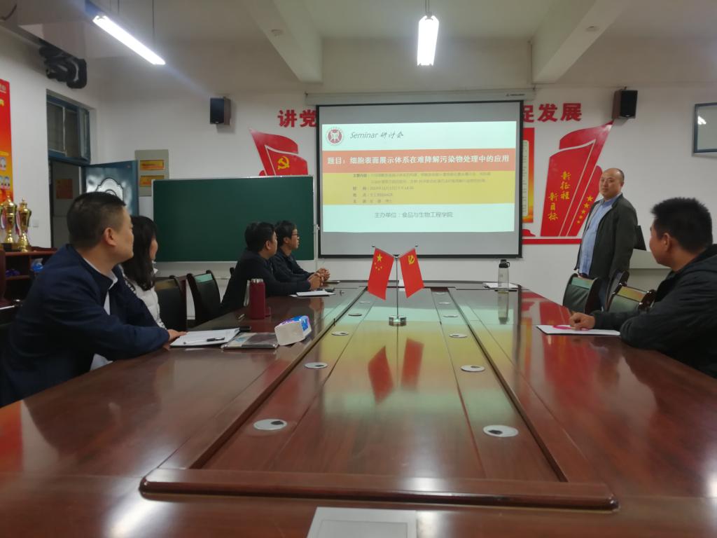 2019年11月15日下午2:30,在生工楼学院会议室举办了“细胞表面展示体系在难降解污染物处理中的应用”Seminar研讨会,研讨会由副院长邹建主持,张震博士主汇报了相关科研进展情况。