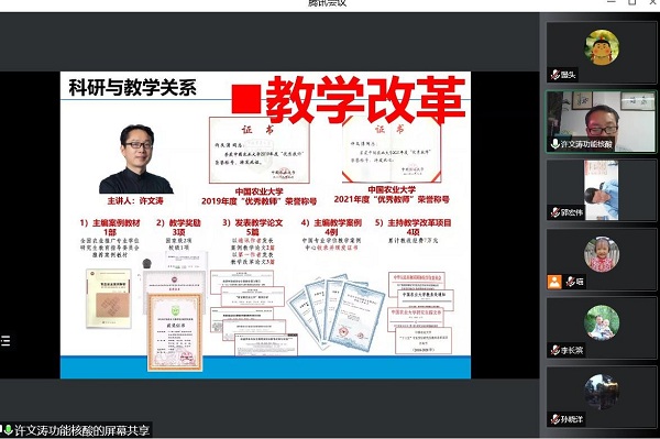 许文涛教授结合自身的教学和科研经验为大家分享了高校教师应该如何把握教学和科研的关系。他指出,一是要学院教学科研两条腿走路,要坚持以科研反哺教学,以教学促进科研;二是要敢于突破,勇于拼搏。青年教师既要坚持循序渐进,在课题申报上一步一个脚印,又要善于突破自我,有勇气尝试申报各类高层次的课题和项目;三是要结合自身的研究专长,尽早聚焦自己的研究内容和方向。随后,许教授介绍了河南省和中国农业大学共建的中原食品实验室的基本情况,希望青年教师能够借助省级重点科研平台,积极参与到高层次项目中来。