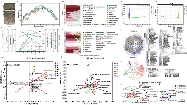 该文章以河南仰韶酒业有限公司陶融型白酒大曲为发酵模型,对大曲发酵的关键工艺点时期样品采用高通量测序技术分析微生物群落,利用非靶向代谢组学分析挥发性代谢物质、理化分析环境因子和酶活性,通过单因素相关性网络分析微生物与微生物之间相互作用关系,通过CCA或RDA构建大曲发酵过程中核心属与理化性质之间的潜在相关性,通过可视化网络分析大曲核心功能微生物与挥发性代谢物的相关性,通过KEGGPATHWAY富集分析和PICRUSt2功能预测构建大曲发酵的代谢网络。该研究明确了大曲微生物群、理化性质和挥发性代谢物的动态变化规律,明确了大曲发酵微生物群落演替的驱动因素、功能微生物菌群组成和代谢途径。研究结果有利于规范化生产质量稳定的大曲,并为实现酿酒微生态组装与定向可控发酵提供理论基础。