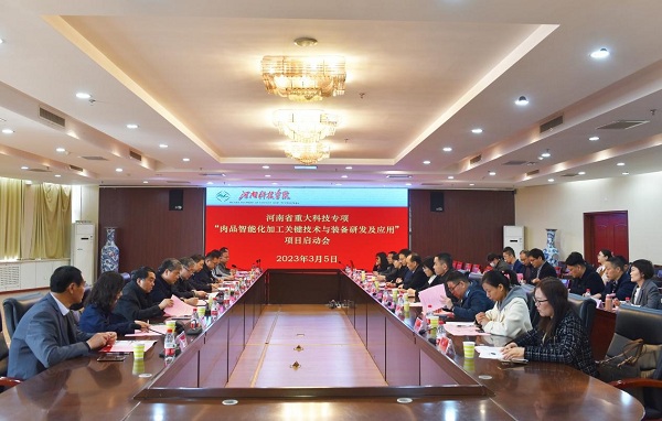 3月5日,河南省重大科技专项“肉品智能化加工关键技术与装备研发及应用”启动会在河南科技学院召开。省科技厅现代农业农村科技处处长李锦辉,河南科技学院副校长贾积身,河南科技学院科技处处长、项目主持人马汉军教授出席会议。参加会议的还有来自郑州大学、河南农业大学、 williamhill威廉希尔、河南双汇投资发展股份有限公司等10多家单位的专家学者及课题组成员40余人。作为子课题承担单位之一,我校肉品团队的郝修振教授、高雪琴博士受邀参加了会议。
