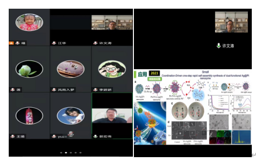 许文涛教授从“功能核酸的发现、定义、多样性、应用和未来发展”等方面对功能核酸生物在生物传感及食品安全检测领域做了总体的概括和介绍,用丰富和简洁明了的语言详细讲解了功能核酸在生物传感体系构建中的地位和作用、基于功能核酸的纳米材料组装和应用、功能核酸的裁剪及修饰等前沿性科研内容。现场的青年教师也在报告中感受到了许文涛教授“认真做科研”、“多帮助多学习”、“严格要求自我”等科研态度。报告结束后,许文涛教授与线上的教师进行了热烈的讨论和交流,受到了参会人员的高度评价。