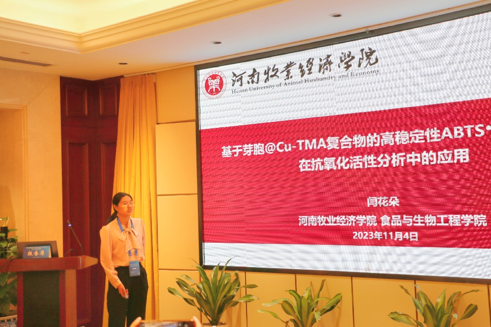 2023年11月4日-5日,由中国畜牧兽医学会兽医食品卫生学分会主办,扬州大学承办的中国畜牧兽医学会兽医食品卫生学分会第十七次学术交流会在江苏省扬州市召开。我院青年教师闫花朵应邀参加了此次会议并作了题为《基于芽胞@Cu-TMA复合物的高稳定性ABTS●+的制备及其在抗氧化活性分析中的应用》的学术报告。