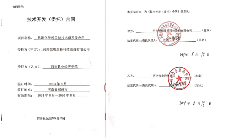 近日,我院预制菜团队在学校科研处指导下,与河南恒瑞淀粉科技股份有限公司签订“抗消化淀粉关键技术研发及应用”横向项目,本项目由预制菜团队成员侯银臣博士主持,项目经费共计15万元,一次到账。