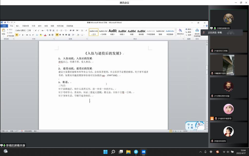 为帮助同学们树立良好的就业观念,提高对未来发展的信心与动力,使毕业班学生找准就业方向,同时为低年级学生提前做好职业规划。4月17日下午,食品与生物工程学院邀请16级毕业生李翔、17级毕业生张鑫鑫、18级应届毕业生李博,以腾讯线上会议的形式为学院在校生分享本人就业经验。