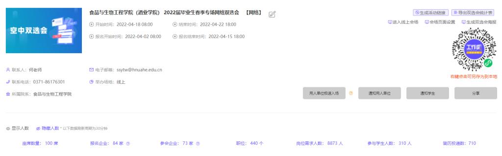 为进一步促进2022届毕业生就业工作,搭建毕业生与用人单位之间的交流平台。食品与生物工程学院于4月18日—4月22日举办了2022届毕业生春季专场网络双选会,为毕业生和用人单位搭建了一个良好的平台,给毕业生带来了更多的就业机会。
